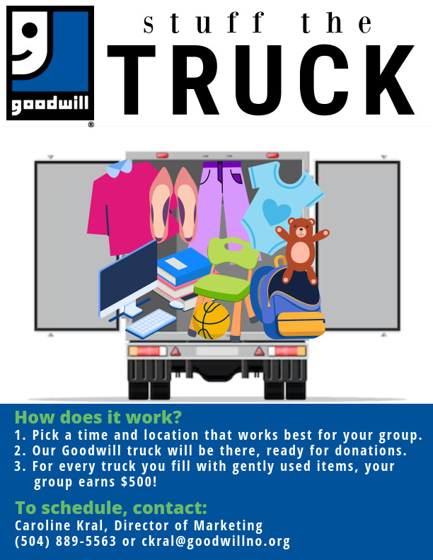 By participating in our inaugural “Stuff the Truck” event, you can declutter your home, keep materials out of our local landfills, raise money for your school AND help us spread the Goodwill mission.